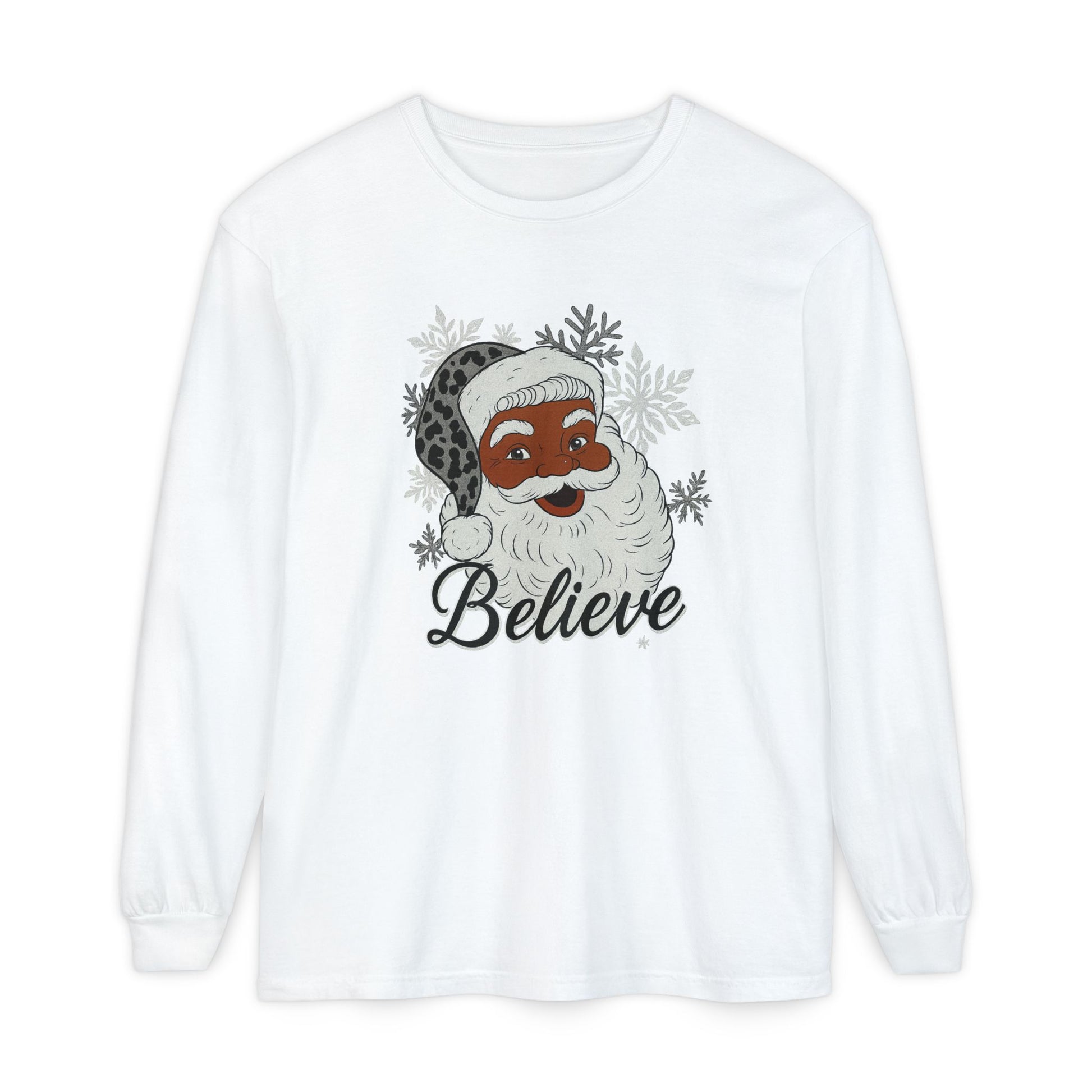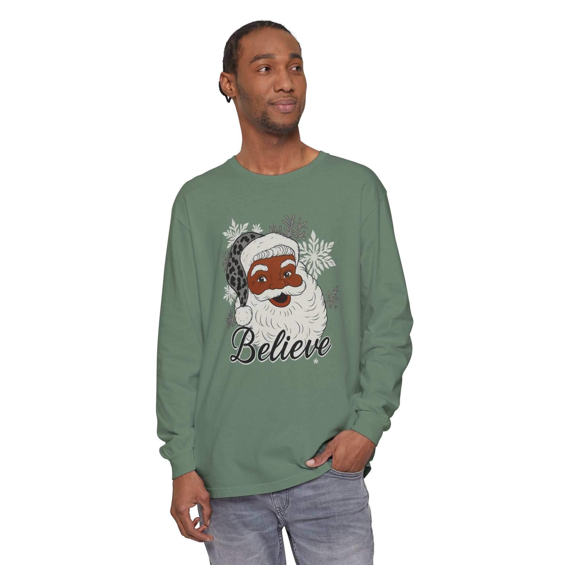 Embrace the holiday spirit with this cozy Unisex Long Sleeve T-Shirt. Crafted for comfort, its soft garment-dyed fabric offers a relaxed fit perfect for festive gatherings or cozy nights by the fire. The cheerful "Believe" design, featuring a whimsical Santa, adds a touch of joy, making it an ideal choice for anyone looking to spread holiday cheer. This shirt is perfect for Christmas celebrations and winter gatherings, catering to those who appreciate fun and festive apparel. It's a superb gift for family and friends who love to showcase their holiday spirit in style!